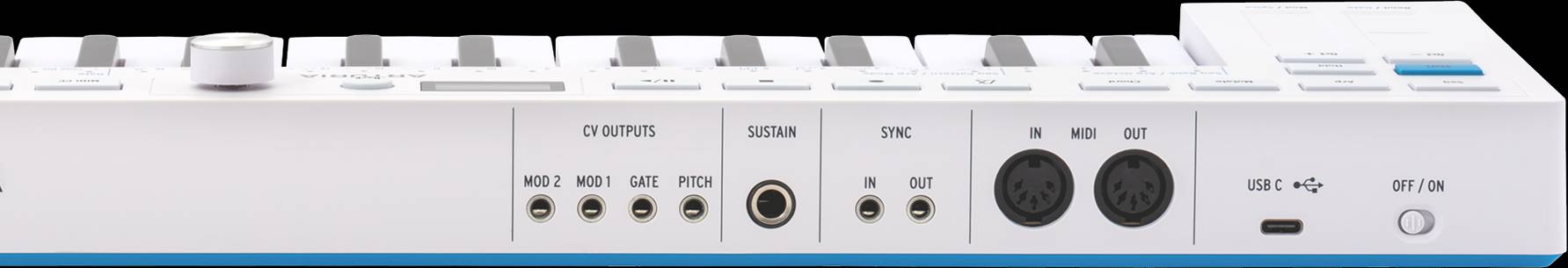 Vintage ekipmanlar için 3,5 mm Sync In/Out, duygu için TRS sustain/expression girişi, artı harici tuşlardan modüler çalmak için MIDI In → CV.