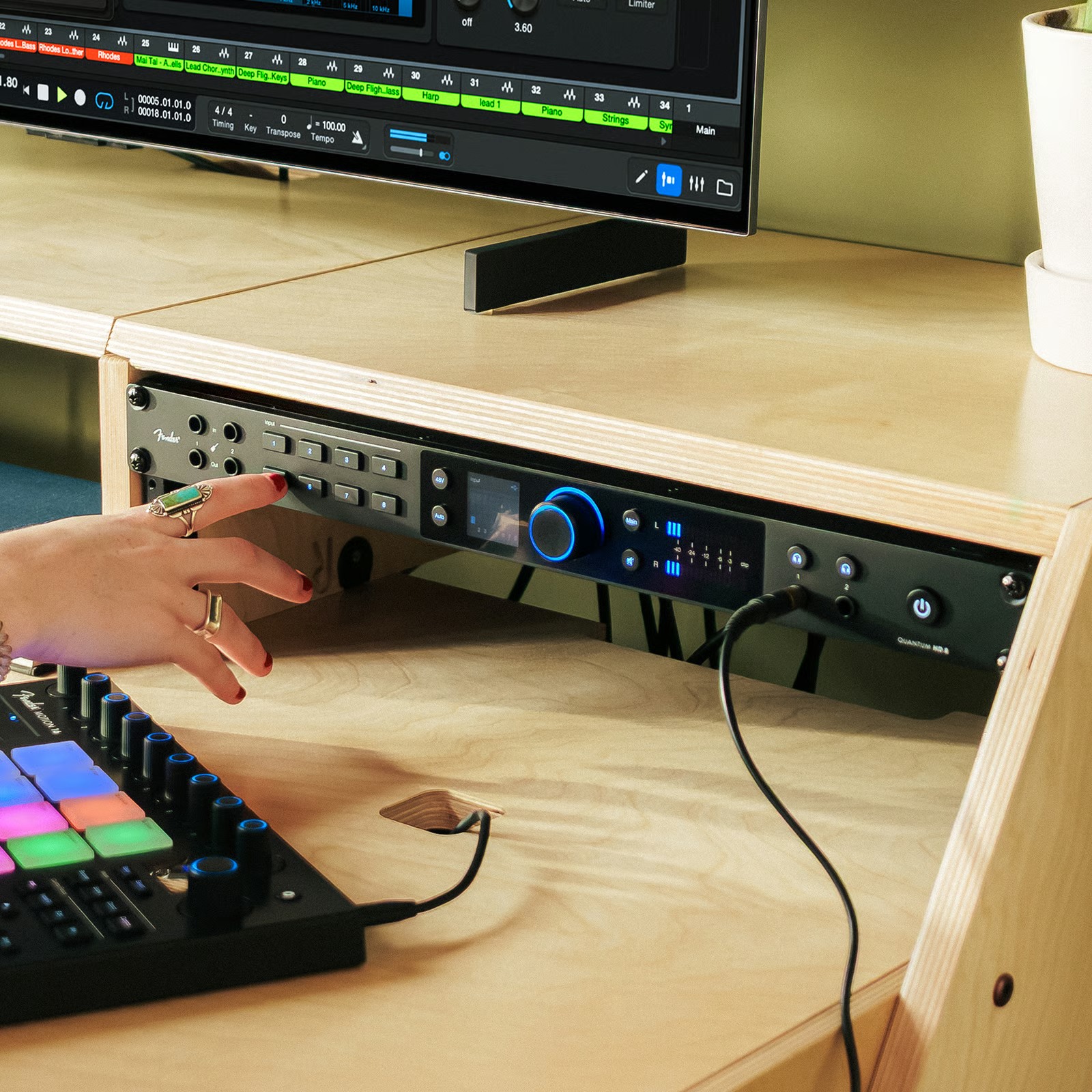 Ön paneldeki Fender enstrüman girişleri, Auto Gain ve re-amp çıkışları hızlı kurulum ve yaratıcı esneklik sağlar. Genişletilmiş giriş/çıkış seçenekleri arasında ADAT girişleri ve çıkışları, ek TRS hat çıkışları, MIDI I/O ve ADAT preamp bağımsız modu bulunuyor — bu sayede stüdyonuzu ölçeklendirmek ve daha büyük oturumları karşılamak kolaylaşıyor.